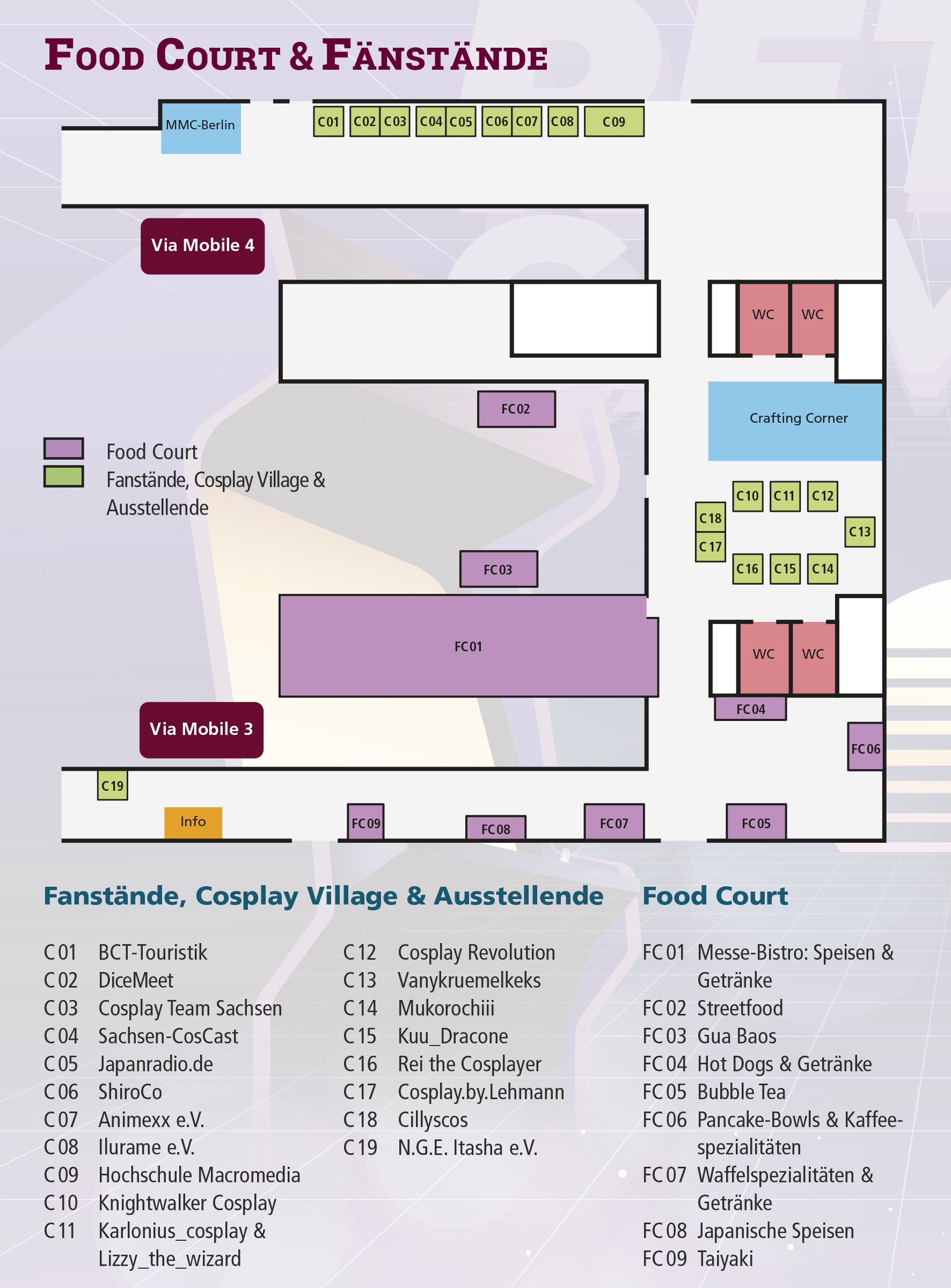 Hier findest du den Standplan für den Food Court, die Fanstände und das Cosplay Village.